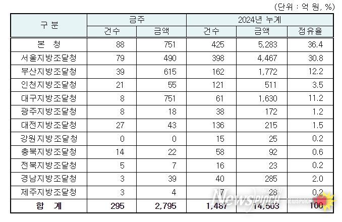 지역별 발주량을 보면 대전광역시 소재 본청 751억 원, 서울지방청 490억 원 등 2개청(1,241억 원)이 전체 금액(2,795억 원)의 44.4%를 차지하고 있으며, 인천 등 나머지 10개 지방청 1,554억 원이 각각 집행될 예정이다.