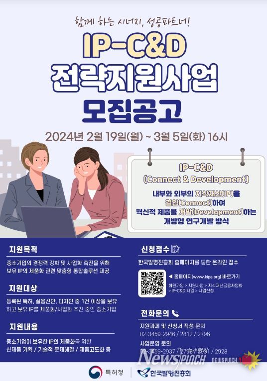 뉴스펀치 장은영 기자 | 특허청은 중소기업이 보유한 지식재산을 바탕으로 맞춤형 사업화를 지원하는 ‘2024년 지식재산 기반 혁신제품 개발(IP-C&D)지식재산 기반 혁신제품 개발 전략지원 사업’에 참여할 기업을 2월 19일부터 3월 5일까지 모집한다고 밝혔다.