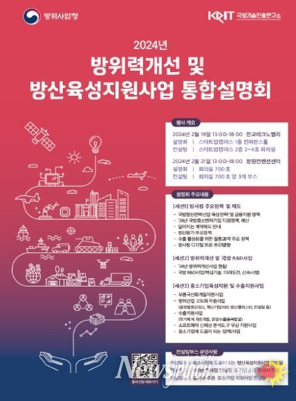 뉴스펀치 장은영 기자 | 방위사업청은 2월 19일, 21일 이틀 동안 방산분야에 참여하고 있거나 참여를 희망하는 대‧중소․벤처기업 등을 대상으로 2024년 착수 예정인 주요 방위력개선 사업과 방산육성 정책 및 지원 사업, 달라지는 계약‧원가‧절충교역 제도 등에 대해 설명하고 이해를 돕기 위한‘2024년 방위력개선 및 방산육성지원 사업 통합설명회’를 개최한다.