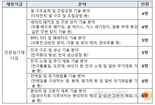 채용 인원은 총 38명이며, 7개 세부 분야 ▲셀 구조설계 및 조립공정 ▲배터리 패키징 및 주변 장치 ▲배터리관리시스템(BMS), 에너지저장시스템(ESS) 및 폐배터리 ▲전극 구조 및 생산 ▲전극 소재 및 무기 재료 ▲전해질 및 유기화합물 ▲분리막 및 고분자 재료 등으로 구분하여 채용한다.