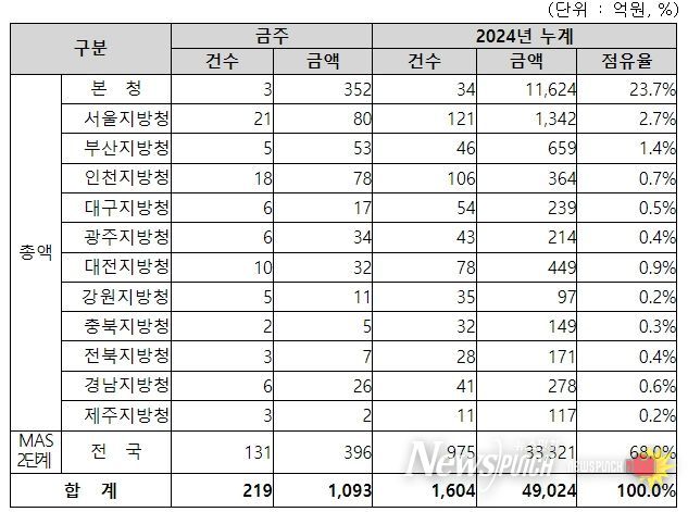 지역별 발주량을 보면, 총액계약 대상 697억 원 중 본청이 352억 원으로 50.5%를 집행하고 서울청 등 11개 지방청에서 345억 원을 각각 집행할 예정이다.