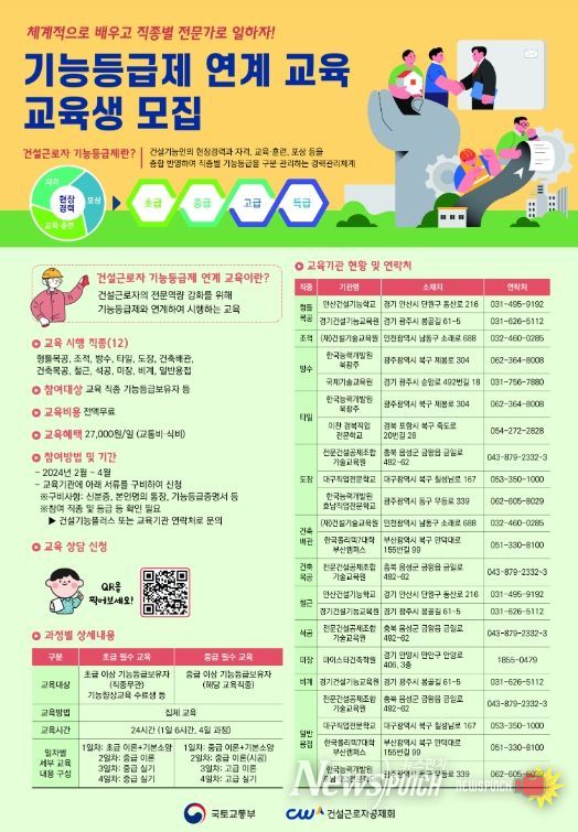 먼저, 건설기능인을 위한 기능등급 연계교육은 건설현장에서 일하는 기능인력의 체계적인 육성을 위해 최초로 시행되고 있는 기능등급별 맞춤 교육으로 건설기능인의 전문성 향상을 위해 국토교통부 주관으로 2022년 최초 실시(6개 직종) 이후, 2023년 12월부터 2배 늘어난 12개 직종으로 확대하여 시행하고 있다.