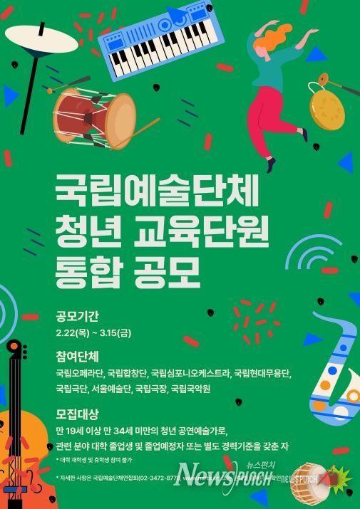 뉴스펀치 김희경 기자 | 문화체육관광부는 6개 국립예술단체, 국립국악원(원장 김영운), 국립극장(극장장 박인건)과 함께 2월 22일부터 3월 15일까지 클래식 음악, 무용, 연극·뮤지컬, 전통 등 4개 공연예술 분야의 청년 교육단원 총 260명을 통합 모집한다.