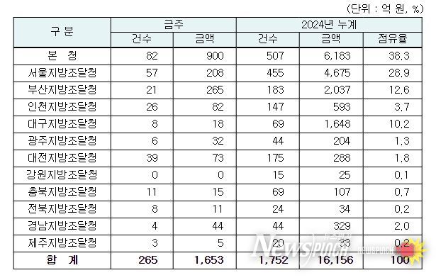 지역별 발주량을 보면 대전광역시 소재 본청 900억 원, 서울지방청 208억 원 등 2개청(1,108억 원)이 전체 금액(1,653억 원)의 67.0%를 차지하고 있으며, 인천 등 나머지 10개 지방청 545억 원이 각각 집행될 예정이다.