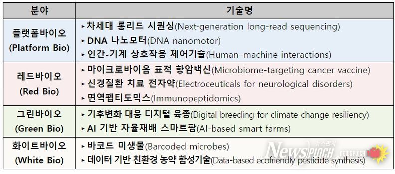 올해 선정된 10대 기술에는 ▴차세대 롱리드 시퀀싱(플랫폼바이오), ▴마이크로바이옴 표적 항암백신(레드바이오), ▴기후변화 대응 디지털 육종(그린바이오), ▴바코드 미생물(화이트바이오) 등이 포함됐다.