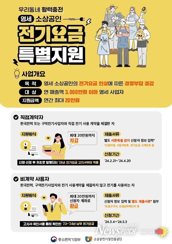 뉴스펀치 장은영 기자 | 중소벤처기업부는 연 매출액 3천만원 이하 영세 소상공인을 위한 전기요금 특별지원 사업 1차 접수(2월 21일 ~ 4월 20일) 개시 이후, 2월 21일부터 2월 25일 18시까지 약 15만건의 신청을 접수했다고 밝혔다.