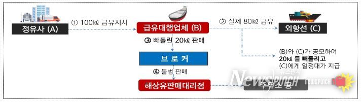 반면, 급유대행업체가 외항선박과 공모하여 정유사로부터 지시받은 해상면세유를 전량 급유하지 않고 일부를 빼돌려 브로커를 통해 해상유판매대리점에게 값싸게 판매하는 등 해상면세유를 불법 유통하고 있다.