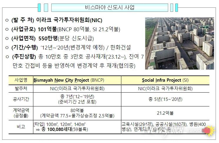 대규모 도시 개발사업인 이라크 비스마야 신도시 사업이 본격 재개됨에 따라 최대 15개의 추가 신도시를 계획 중인 이라크 재건사업 진출에도 청신호가 켜질 것으로 예상된다.