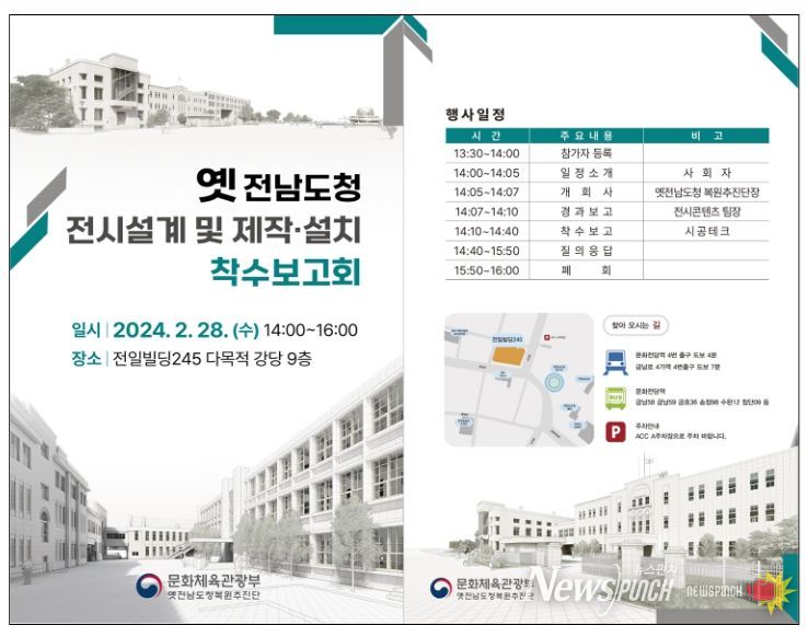 뉴스펀치 김희경 기자 | 문화체육관광부 옛전남도청복원추진단은 2월 28일 오후 2시, 전일빌딩245 9층 대강당에서 ‘옛 전남도청 전시설계 및 제작․설치 착수보고회’를 개최한다.
