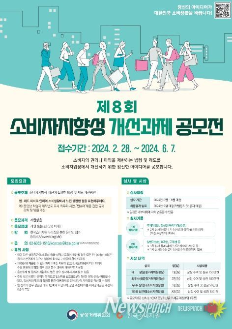 뉴스펀치 장은영 기자 | 공정거래위원회와 한국소비자원(원장 윤수현)은 소비생활에서 경험한 불편 사항 등에 대해 소비자의 다양한 의견과 아이디어를 듣고 이를 법·제도 개선에 반영하고자 '제8회 대국민 소비자지향성 개선과제 공모전'을 개최한다.