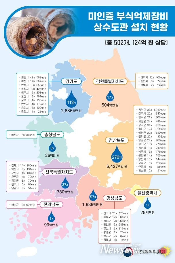 그 결과, 1개 광역지자체와 47개 기초지자체에서 2016년 9월부터 현재까지 약 124억 원 상당의 미인증 부식억제장비 502개를 상수도관에 설치한 것으로 파악됐다. 지자체 중 경상북도가 270개로 가장 많았고, 이어 경기도(112개), 경상남도(57개) 순으로 많았다.
