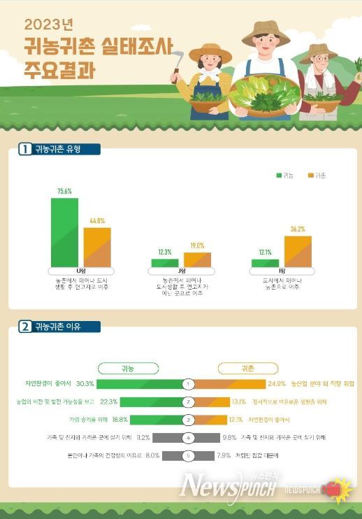 뉴스펀치 장은영 기자 | 농림축산식품부는 2월 28일 '2023년 귀농·귀촌 실태조사' 결과를 발표했다. 이번 실태조사는 최근 5년간(2018~2022년) 귀농·귀촌한 6천 가구를 대상으로 진행됐다.