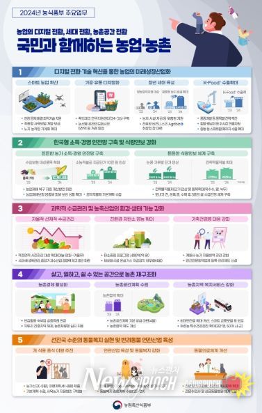 뉴스펀치 장은영 기자 | 농림축산식품부는 농업의 디지털전환·세대전환·농촌공간 전환 등 3대 전환을 바탕으로 국민 모두에게 열린 기회가 되는 농업·농촌을 만들기 위한 2024년 주요 업무계획을 발표했다.