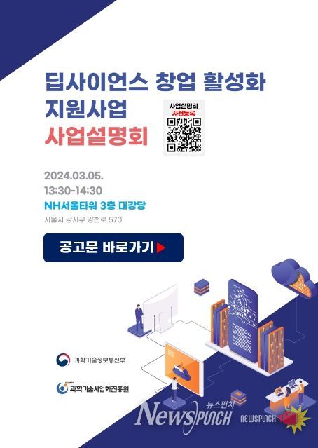 뉴스펀치 장은영 기자 | 과학기술정보통신부와 과학기술사업화진흥원(원장 김봉수)은 ‘딥사이언스 창업 활성화 지원사업 사업설명회(‘24.3.5(화))’를 실시한다고 밝혔다.