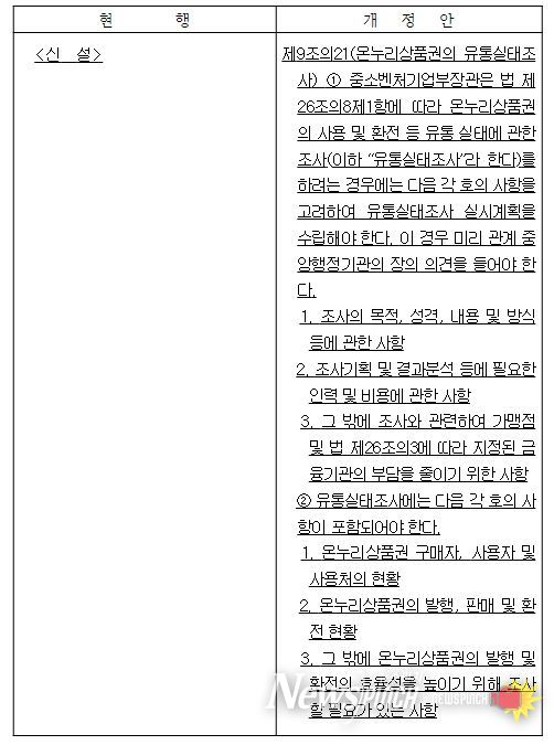 이번 시행령 개정은 온누리상품권 유통 실태조사 근거 및 자료 요청 권한 등을 규정하는 「전통시장 및 상점가 육성을 위한 특별법」이 작년 9월 14일에 개정됨에 따라 시행령에 위임된 필요 사항을 정하는 후속 조치이며, 이번 국무회의 의결을 거쳐 공포일로부터 6개월 후인 올해 3월 15일에 시행된다.