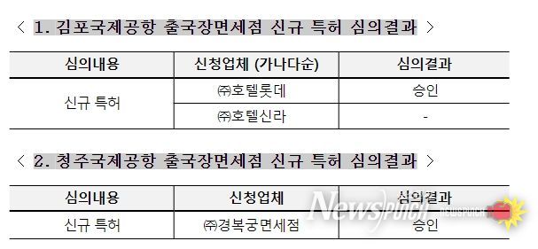 이번 특허심사위원회에서는 ①김포국제공항 출국장 면세점 신규 특허, ②청주국제공항 출국장 면세점 신규 특허 사업자 선정을 의결했다.