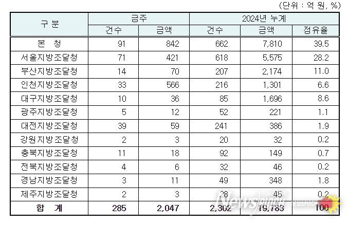 지역별 발주량을 보면 대전광역시 소재 본청 842억 원, 서울지방청 421억 원 등 2개청(1,263억 원)이 전체 금액(2,047억 원)의 61.7%를 차지하고 있으며, 인천 등 나머지 10개 지방청 784억 원이 각각 집행될 예정이다.