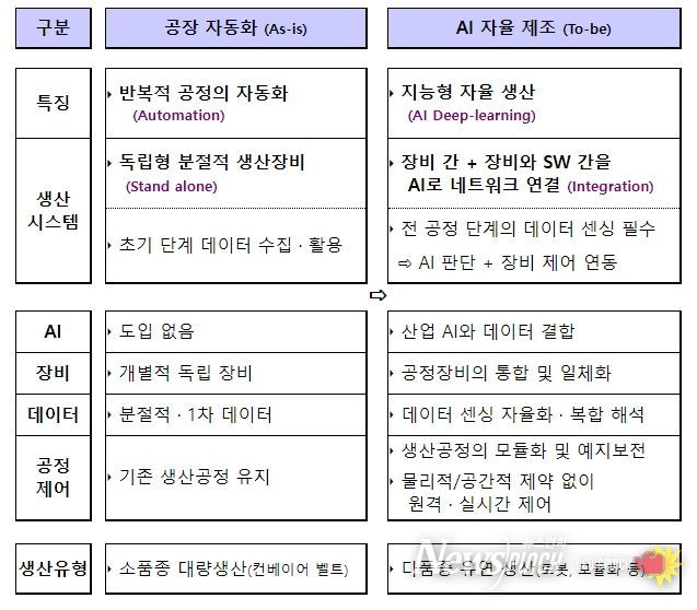 산업부는 주요 제조업의 공정을 분석하여 ➊(지능형 생산) 디지털트윈 등 산업 데이터(Data)와 인공지능(AI)의 결합 시스템, ➋(첨단장비 결합) 공정 단계별 생산장비의 일체화 및 Network 연결, ➌(자율제조 시스템) 시스템 integration을 위한 소프트웨어(SW) 및 알고리즘 체계 등을 중심으로 핵심 요소를 식별하고 도입단계, 부처 간 협업 등을 담은 「AI 자율 제조 마스터플랜」을 상반기 중으로 수립할 계획이다.