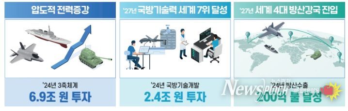 뉴스펀치 장은영 기자 | 방위사업청은 3월 6일 2024년 주요 정책 추진계획을 발표했다. 북핵 등 한반도를 둘러싼 안보 위협이 지속되고, 첨단전력 확보를 위한 세계 각국의 경쟁이 치열해지는 가운데, K-방산을 ‘안보의 기반이자 신성장 동력’으로 육성하기 위한 3대 분야 핵심 목표와 추진과제를 제시했다.