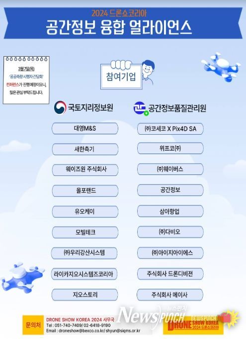 뉴스펀치 장은영 기자 | 국토교통부 국토지리정보원(원장 조우석)은 3월 6일부터 3일간 열리는 ‘2024 드론쇼 코리아’에서 ‘제2차 공간정보 융합 얼라이언스’ 공동 전시관을 운영했다.