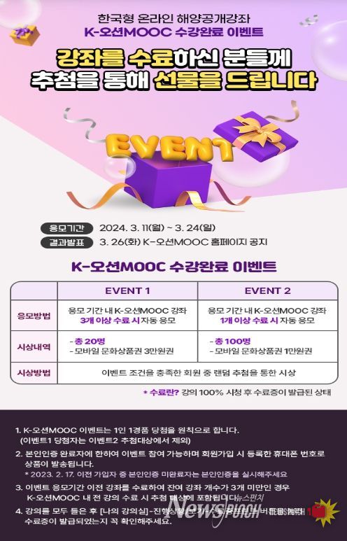 뉴스펀치 김희경 기자 | 해양수산부는 누구나 무료로 바다를 주제로 한 강연을 들을 수 있는 온라인 공개강좌 누리집(K-오션MOOC)에 신규 강좌 업로드를 기념하여 3월 11일부터 수강자를 대상으로 이벤트를 개최한다. 3월 11일부터 3월 24일까지 총 14일간 강좌 1개 이상 수료자 중 추첨을 통해 모바일 기프티콘도 제공하며, 자세한 내용은 누리집을 통해 확인할 수 있다.