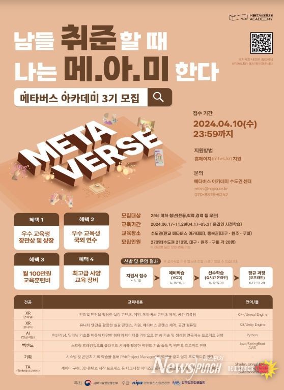 뉴스펀치 장은영 기자 | 과학기술정보통신부는 메타버스(가상융합세계) 분야에 재능과 열정을 가진 청년들이 메타버스 산업을 이끌어 갈 개발자‧창작자로 성장하도록 지원하는 '메타버스 아카데미' 교육생을 4월 10일까지 공개 모집한다.
