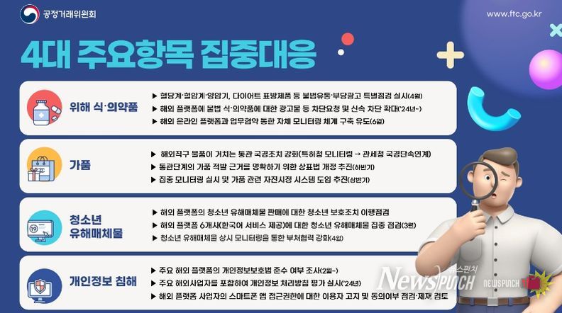 소비자 피해 우려가 큰 4대 주요항목에 대해서는 부처간 공동 대응도 이루어질 예정이다. 식품의약품안전처는 위해 식·의약품 관련 불법유통·부당광고에 대응하기 위해 해외 온라인 플랫폼에 대한 광고 차단 요청, 특별점검 등 관리를 강화할 예정이다.