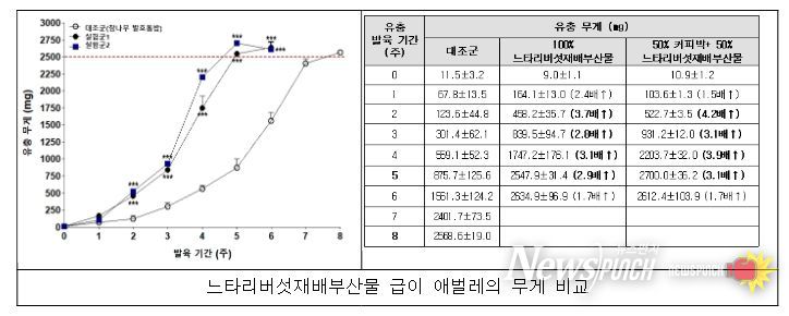 이번에 개발한 먹이원은 수확하고 남은 느타리버섯 배지 또는 커피박과 느타리버섯 배지를 1대1 비율로 섞은 것에 물을 65% 첨가해 잘 섞은 후 공기가 잘 통하는 마대에 30~40리터(L)씩 나눠 담은 후 6주 동안 발효시켜 만든 것이다.