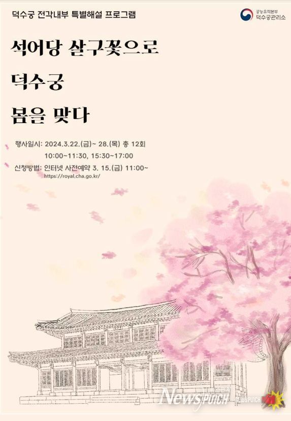 뉴스펀치 김희경 기자 | 문화재청 궁능유적본부 덕수궁관리소(소장 권점수)는 봄을 맞아 오는 22일부터 28일까지 매일 2회(오전 10시, 오후 3시 30분) 덕수궁 주요 전각 내부를 관람하며 살구꽃을 감상할 수 있는 특별해설 프로그램을 운영한다.