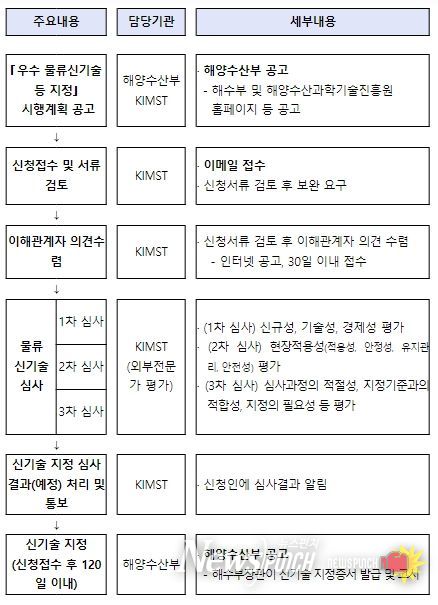 해양수산부와 해양수산과학기술진흥원은 접수된 기술에 대해 30일간 이해관계자 의견 수렴을 거쳐 신기술 여부를 검증한 후, 기술분야별 전문분과위원회를 통해 1차 서류심사로 기술성, 경제성 등을 평가한다. 이어, 2차 현장심사와 3차 종합심사위원회 심사를 거쳐 접수후 120일 이내에 ‘우수 물류신기술’을 선정하고 지정증서를 수여할 계획이다.