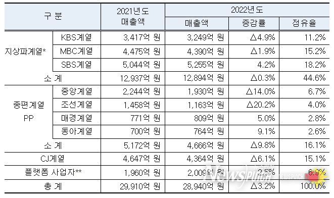 2022년도 방송광고시장은 전년(2조 9,910억 원) 대비 3.2% 감소한 2조 8,940억 원으로 조사됐고, 협찬매출액은 8,446억 원으로 전년(8,377억 원) 대비 소폭(0.8%) 증가했다.