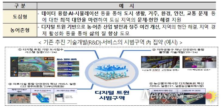 뉴스펀치 장은영 기자 | 과학기술정보통신부와 디지털플랫폼정부위원회는 한국지능정보사회진흥원와 함께 ’24년 3월 13일부터 ‘디지털 트윈 시범구역’ 공모를 실시하고 도시와 농어촌(도농복합시) 2곳을 시범구역으로 선정할 계획이라고 밝혔다.