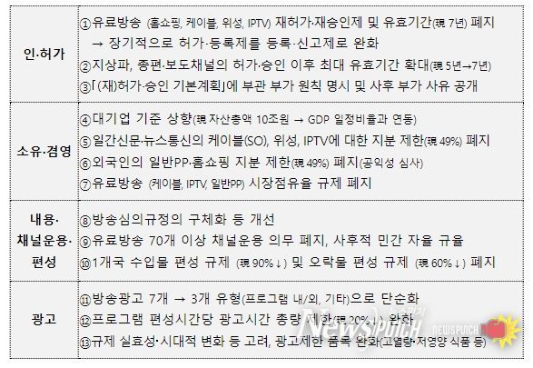 대표적으로 유료방송(홈쇼핑, 케이블, 위성, IPTV)의 재허가·재승인제를 폐지하고, 지상파방송 및 종편·보도 채널의 최대 유효기간을 확대(現 5년 → 7년)한다.