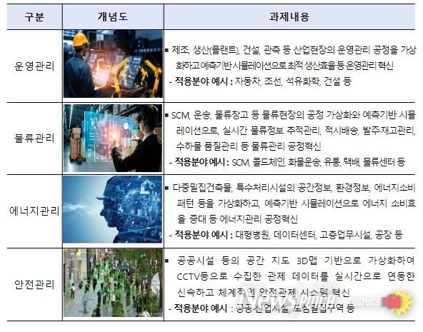 먼저, 운영관리 분야는 제조, 생산, 건설 등 산업현장의 운영관리 공정 가상화 및 최적생산, 유연생산, 예방정비 등이 가능한 '메타버스 운영관리 플랫폼 개발 및 실증' 과제에 대해 2년간 최대 40억원을 지원한다.