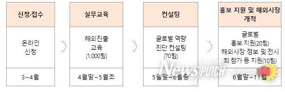 지원 규모는 실무교육 1,000팀, 컨설팅 70팀이며 이중 국제적(글로벌) 진출 가능성이 높은 기업을 대상으로 선발을 거쳐 홍보 지원 20팀, 해외시장개척 10팀을 선정하여 지원할 예정이다.