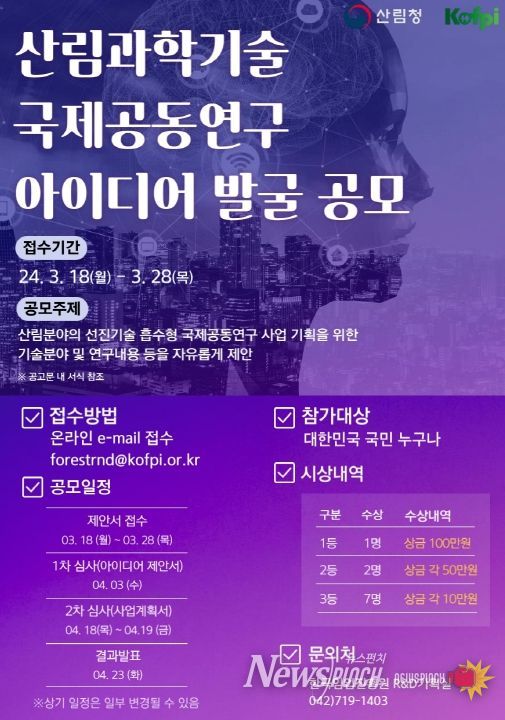 이번 공모전은 국민의 혁신적인 아이디어를 모아 산림과학기술 분야에서 국제공동연구가 필요한 과제를 발굴해 글로벌 경쟁력을 강화하는 데 목적이 있다.