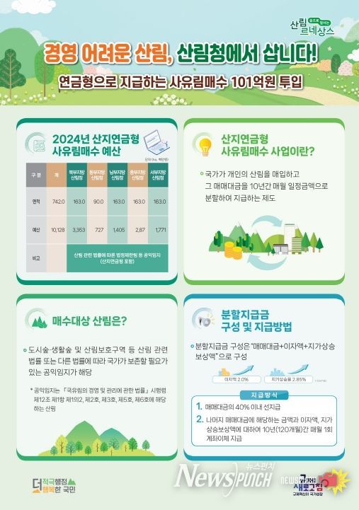 뉴스펀치 장은영 기자 | 산림청은 18일 ‘산지연금형 사유림 매수사업’으로 규제에 묶여 있는 사유림 742ha를 101억 원을 들여 매수한다고 밝혔다.