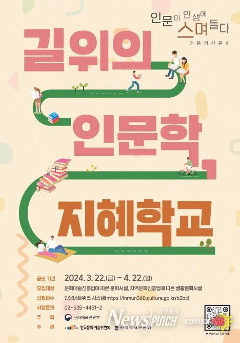 뉴스펀치 김희경 기자 | 문화체육관광부는 한국문화예술위원회와 함께 ‘길 위의 인문학’과 ‘지혜학교’ 프로그램을 운영할 문화시설과 인문프로그램을 3월 22일부터 4월 22일까지 ‘인문네트워크’에서 공개 모집한다.