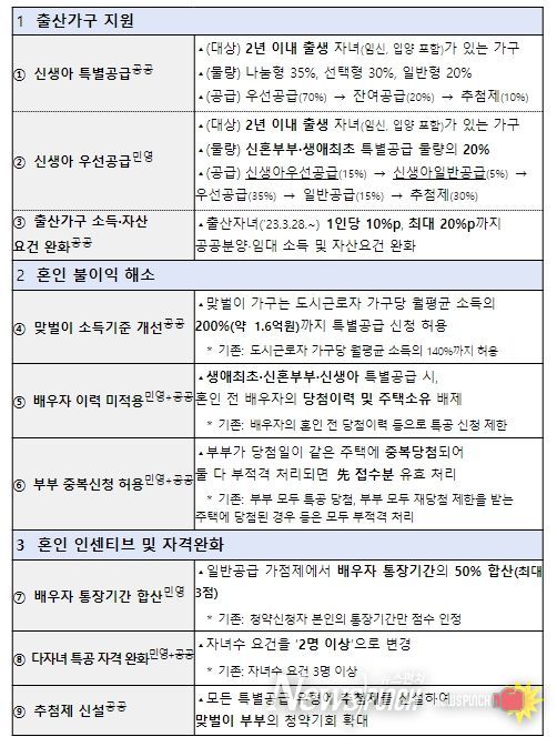 지난해 합계출산율은 0.72명으로 역대 최저를 기록, 국가 소멸 위기감이 고조되고 있다. 이에, 국토교통부는 주택 청약 시 결혼 페널티를 없애고, 출산 가구가 더 많은 내 집 마련 기회를 가질 수 있도록 청약 제도를 개선했다. 세부 내용은 아래와 같다.