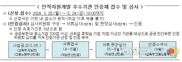 [제호고용노동부와 교육부는 3월 25일 ‘2024년도 인적자원개발 우수기관(Best HRD) 인증’ 선정 계획을 공고한다.