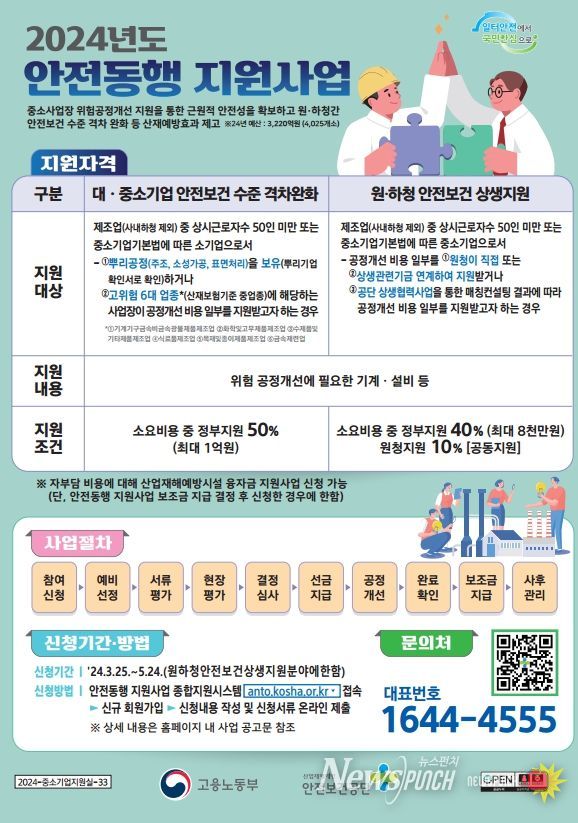 뉴스펀치 장은영 기자 | 산업재해 예방을 위해 '안전동행 지원사업'으로 정부와 원청(대기업)의 재정지원을 받아 위험공정을 개선하고자 하는 중소사업장은 3월25일부터 추가 신청을 할 수 있게 됐다.