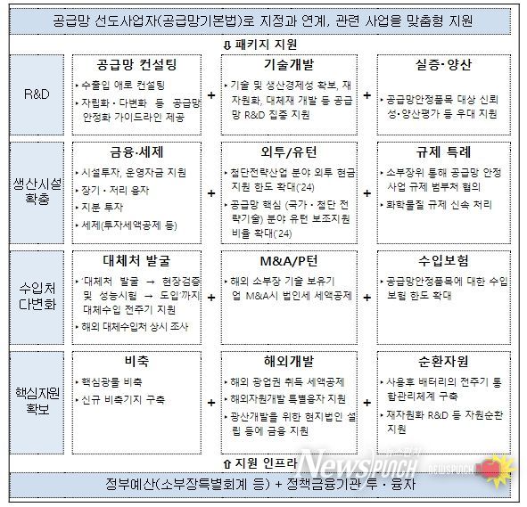 산업부는 이들 프로젝트의 공급망 안정화를 관계부처·기관 등과 협업하여 적극 검토/추진하기로 하였다. 먼저, 기술개발, 생산투자, 대체처, 비축 등 공급망 종합 지원사업 메뉴판을 마련하고 맞춤형으로 패키지 지원한다. 국내 생산시설 확충을 위한 재정·금융·세제 등 추가 지원방안도 검토한다. 또한, 수급 위험이 큰 품목은 연간 수급관리계획을 수립해 공공비축 확대, 민간 재고 확보 등을 선제적으로 추진하다. 아울러, 프로젝트별로 업계-지원기관 등으로 민관 합동 공급망 얼라이언스를 구성해 공급망 안정화 과제 및 애로를 상시 발굴하고, 금융, 무역, R&D, 핵심광물 등 관계기관으로 공급망 지원기관 협의체를 운영해 이를 신속히 해결해 나간다.