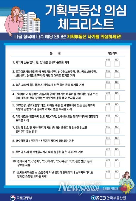 이에, 국토부는 부동산 불법행위 통합신고 센터 메인화면에서 기획부동산 체크리스트 등을 제공하는 한편, 올해 6월 30일까지 위법 의심사례 집중신고 기간을 운영할 계획이다.