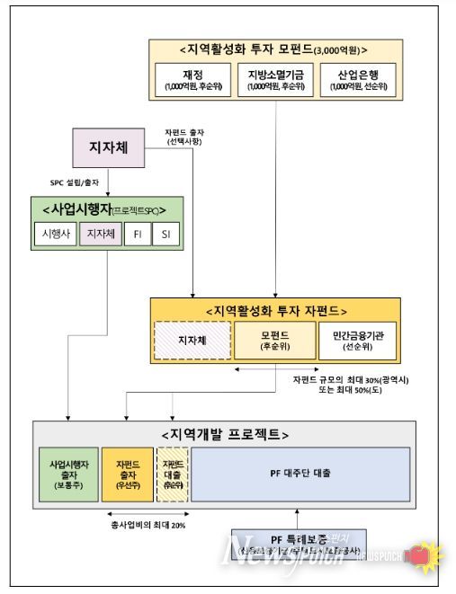 정부재정, 지방소멸대응기금, 산업은행에서 각각 1,000억원씩 출자하여 3,000억원 규모 모(母)펀드를 조성하고, 지자체․민간이 함께 자(子)펀드 결성과 프로젝트 특수목적법인(SPC) 설립을 통해 총 3조원 규모의 다양한 지역활성화 프로젝트에 투자한다.