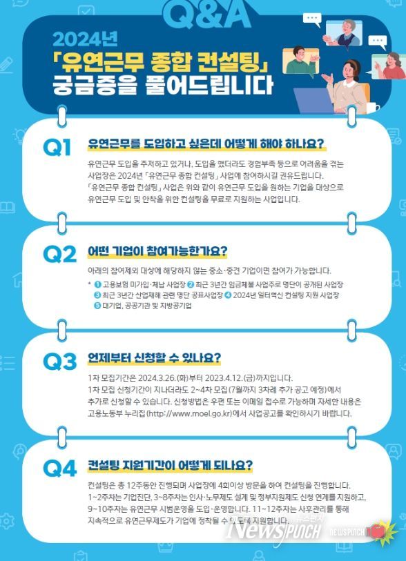 고용노동부(장관 이정식)는 기존의 “재택근무 컨설팅”을 올해부터 “유연근무 종합 컨설팅”으로 기능을 확대하고, 3.26.(화)부터 컨설팅을 원하는 중소·중견기업의 신청을 받는다고 밝혔다.