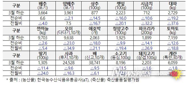 농식품부는 3월 들어 정부의 비축 물량 방출, 할당관세 물량 공급 확대, 납품단가 지원 및 할인지원 확대 등 긴급 가격안정대책 추진으로 3월 하순 주요 농축산물의 소비자가격은 전월 대비 사과 16.3%, 대파 37.6% 하락하는 등 전반적으로 하향세를 보이고 있다고 밝혔다.