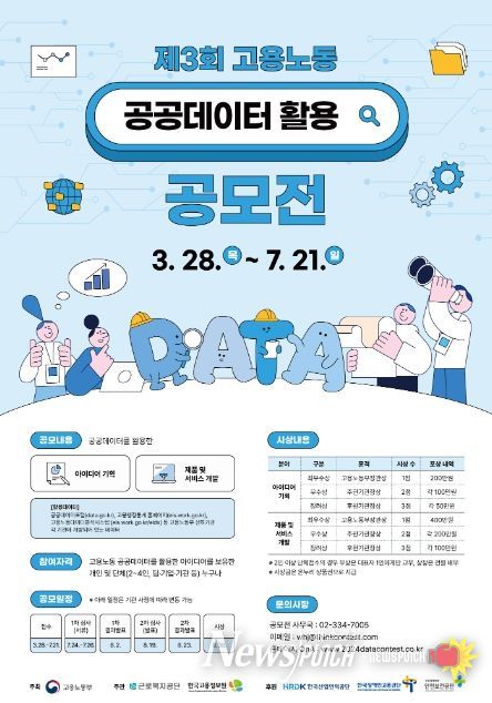 뉴스펀치 장은영 기자 | 한국고용정보원(원장 김영중)과 근로복지공단(이사장 박종길)은 3월28일부터 '제3회 고용노동 공공데이터 활용 아이디어 공모전'을 공동으로 개최한다고 밝혔다.