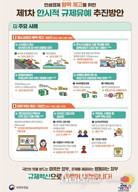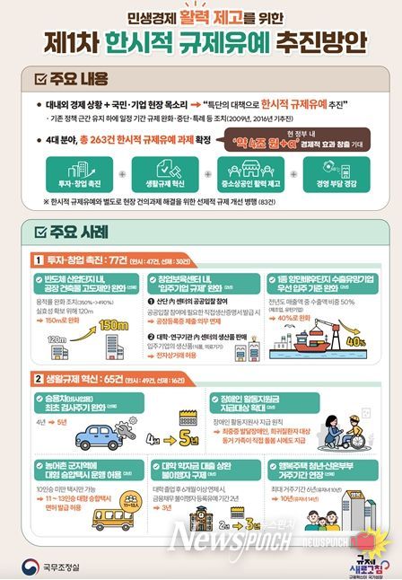 뉴스펀치 장은영 기자 | 정부(국무조정실장 : 방기선)는 민생경제 활력 제고를 위한 ‘제1차 한시적 규제유예 방안’을 추진한다.