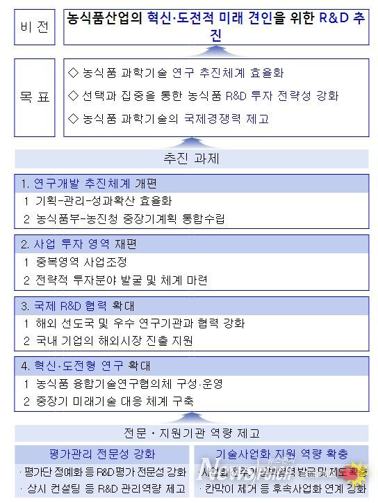 첫째, 연구개발 추진체계를 개편한다. 농식품부와 농촌진흥청이 연구개발사업을 함께 기획하고, 사업관리는 농림식품기술기획평가원, 성과확산은 한국농업기술진흥원 중심으로 개편하여 기획-관리-성과확산 체계를 효율화한다. 또한 각기 추진하던 농식품부와 농진청의 중장기계획을 통합하여 수립한다.