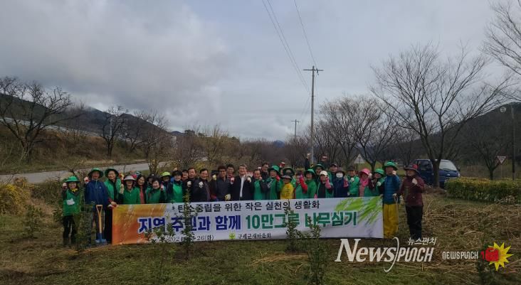 뉴스펀치 김희경 기자 | 구례군새마을회는 3월26일 새마을협의회․부녀회 회원 40여명과 함께 산동면 산업도로 옆 공유지 9,917㎡에 잣나무 800그루, 낙엽송 480그루, 은목서 50그루, 수국 50그루를 탄소중립 실천을 위한 나무심기 행사를 실시했다.